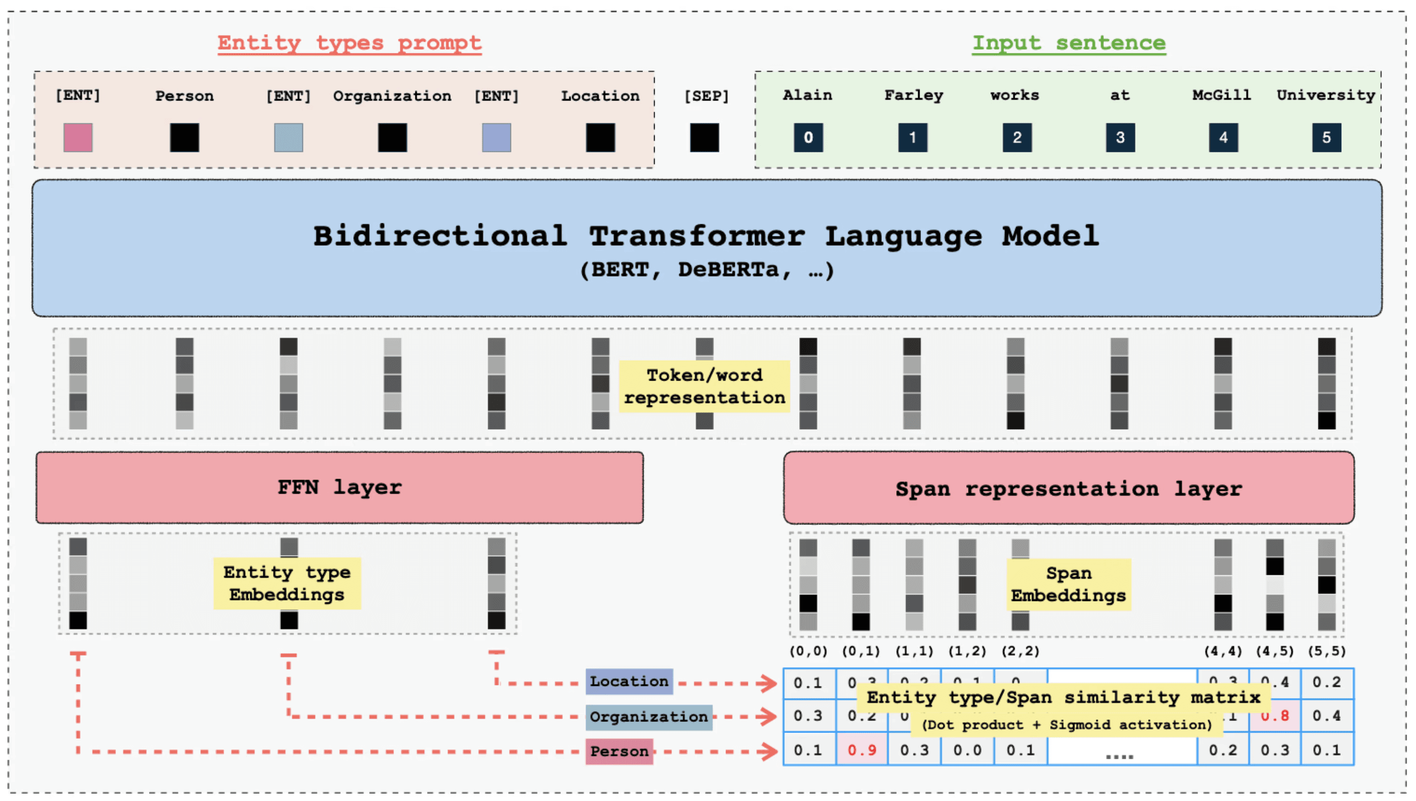 GLiNER's innovation lies in both its return to a bidirectional encoder architecture and its treatment of NER as a matching algorithm.