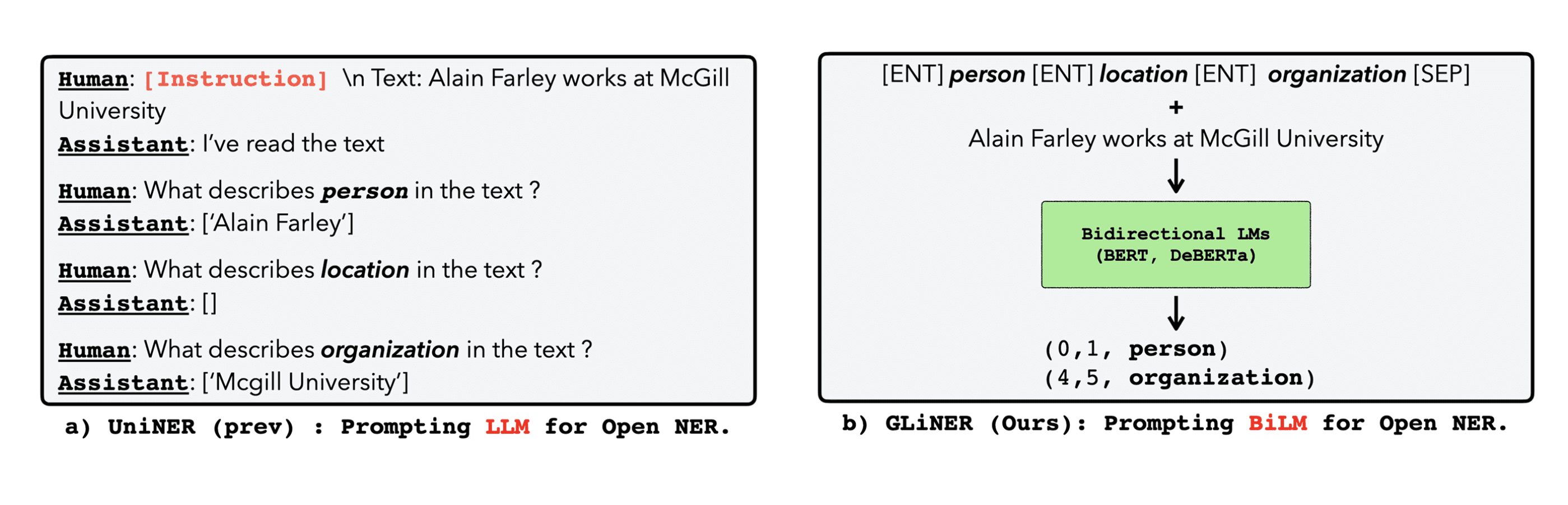 GLiNER is a bidirectional encoder (BERT-based) model. Bidirectional models use the context both before and after a given token to build their understanding and representation of it, as opposed to unidirectional models like GPT-5 or Google Gemini, which only use the context preceding a given token to understand it.