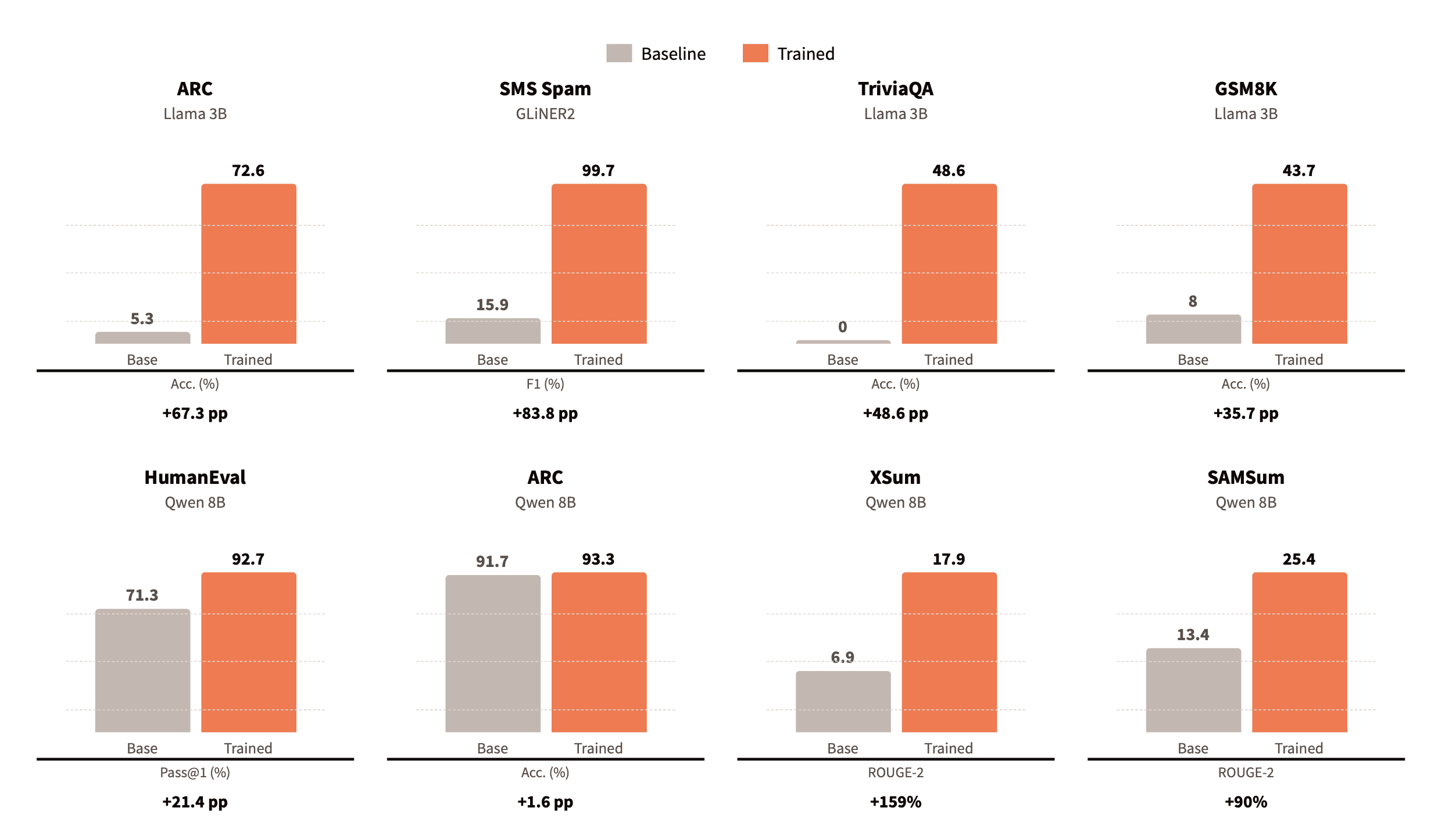 We conducted a rigorous evaluation of Pioneer's fine-tuning agents across eight benchmarks spanning reasoning, math, code generation, summarization, and classification.