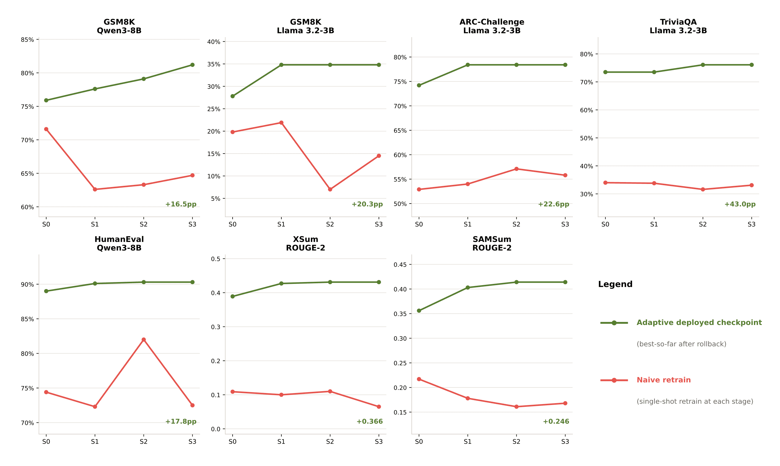 For adaptive inference, we evaluated across seven scenarios with accumulating noise designed to simulate real-world deployment drift. Pioneer maintained monotonic improvement across all scenarios while naive retraining degraded, with final performance gaps of up to 43 percentage points.